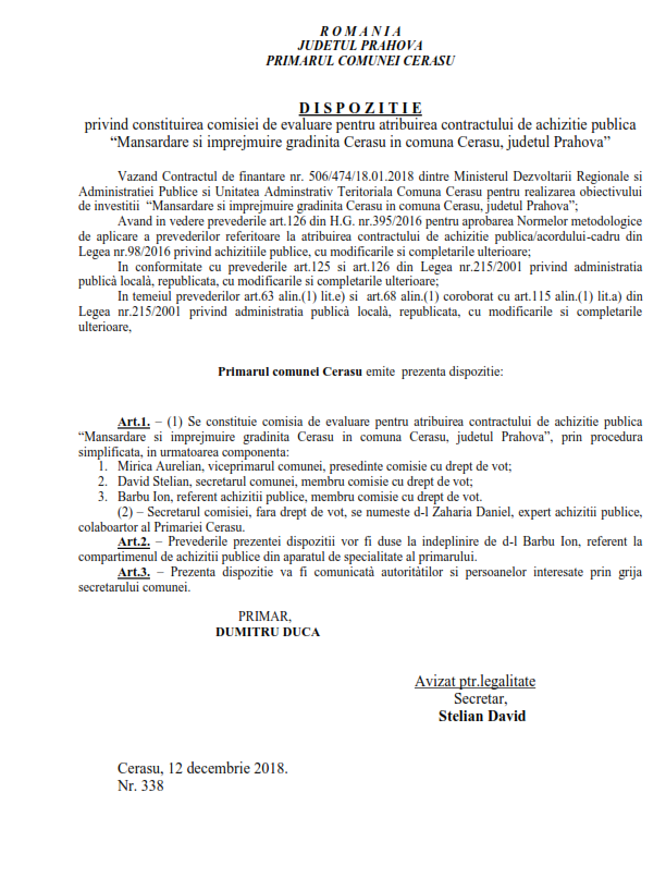 37. Dispozitia nr. 338 din data de 12 Decembrie 2018 privind constituirea comisiei de evaluare pentru atribuirea contractului de achizitie publica "Mansarde si imprejmuire gradinita Cerasu in comuna Cerasu, judetul Prahova"