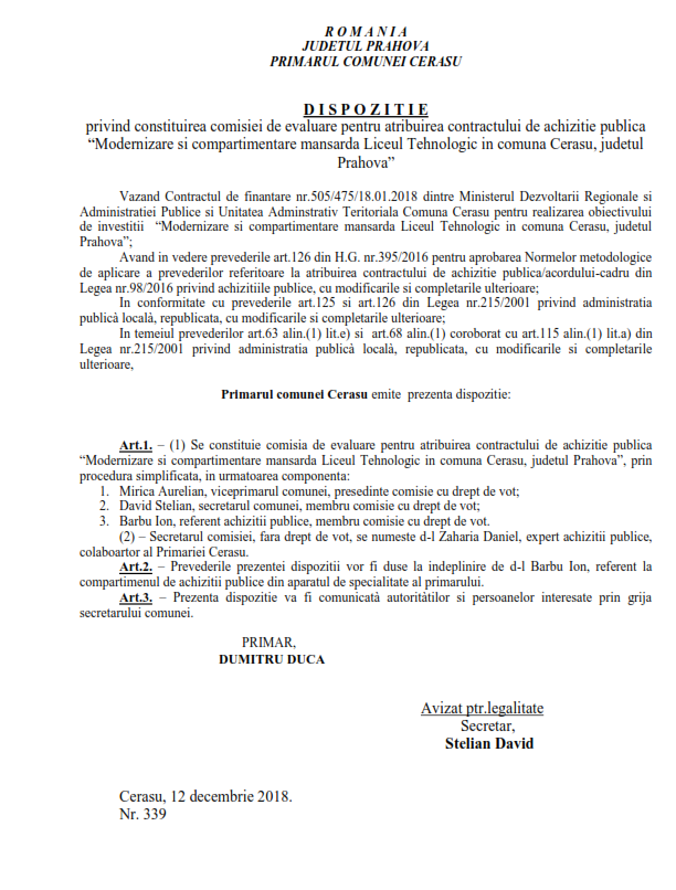 38. Dispozitia nr. 339 din data de 12 Decembrie 2018 privind constituirea comisiei de evaluare pentru atribuirea contractului de achizitie publica "Modernizare si compartimentare mansarda Liceul Tehnologic in comuna Cerasu, judetul Prahova"