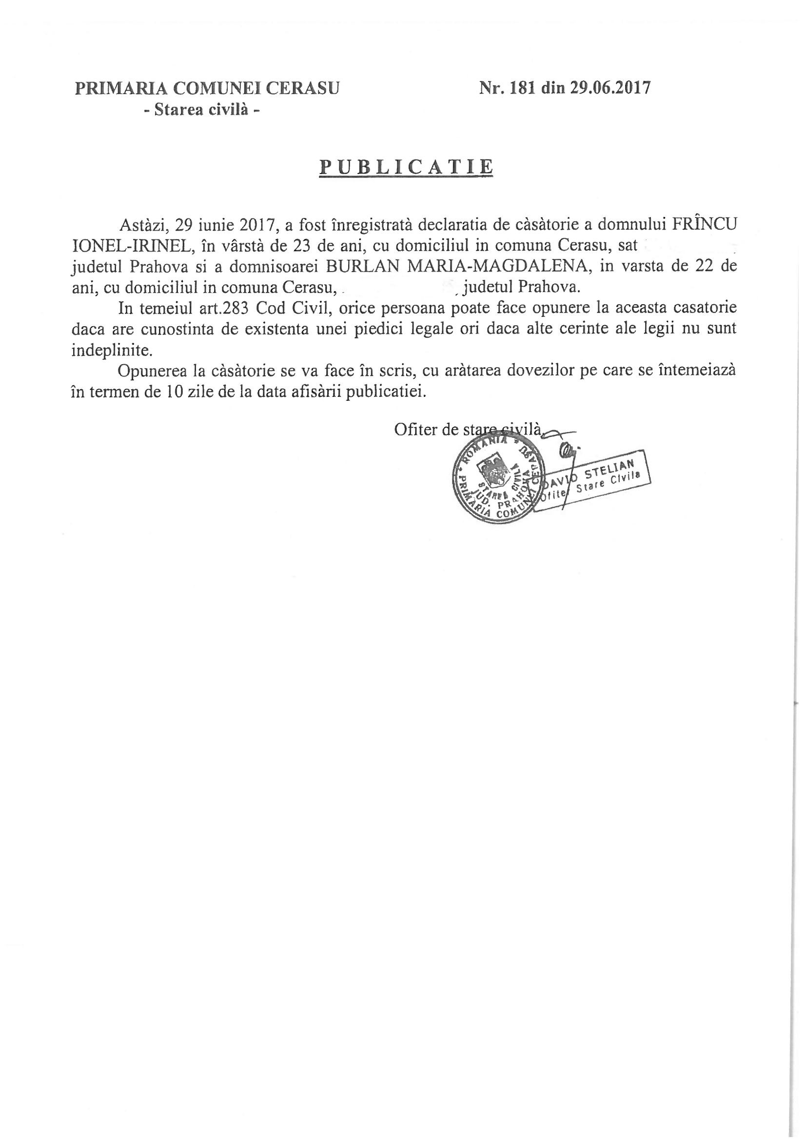 9. Publicatia nr. 181 din data de 29.06.2017 (Frincu Ionel Irinel si Burlan Maria Magdalena)