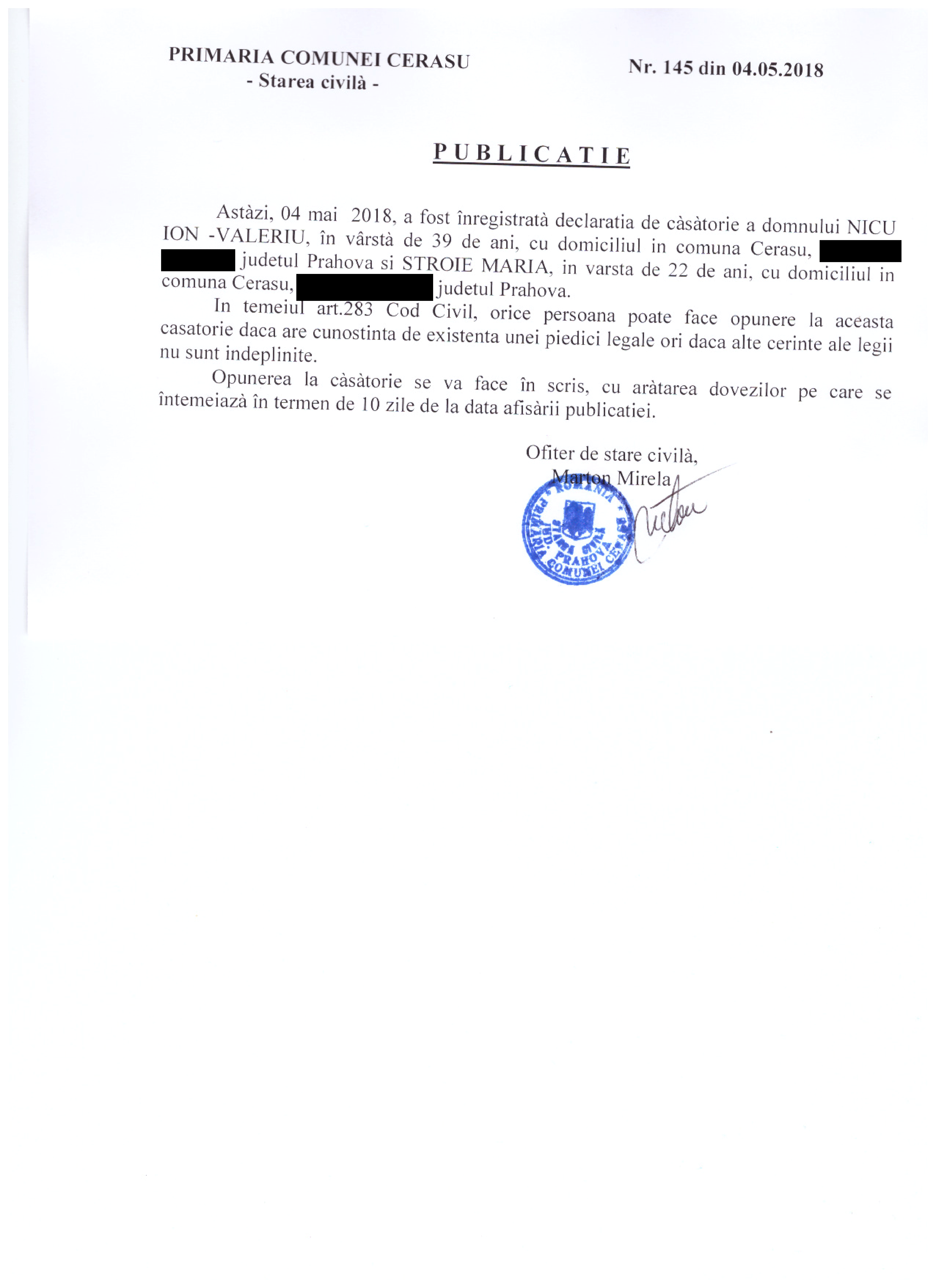 31. Publicatia de casatorie nr. 145 din data de 04.05.2018 (Nicu Ion Valeriu si Stroie Maria)