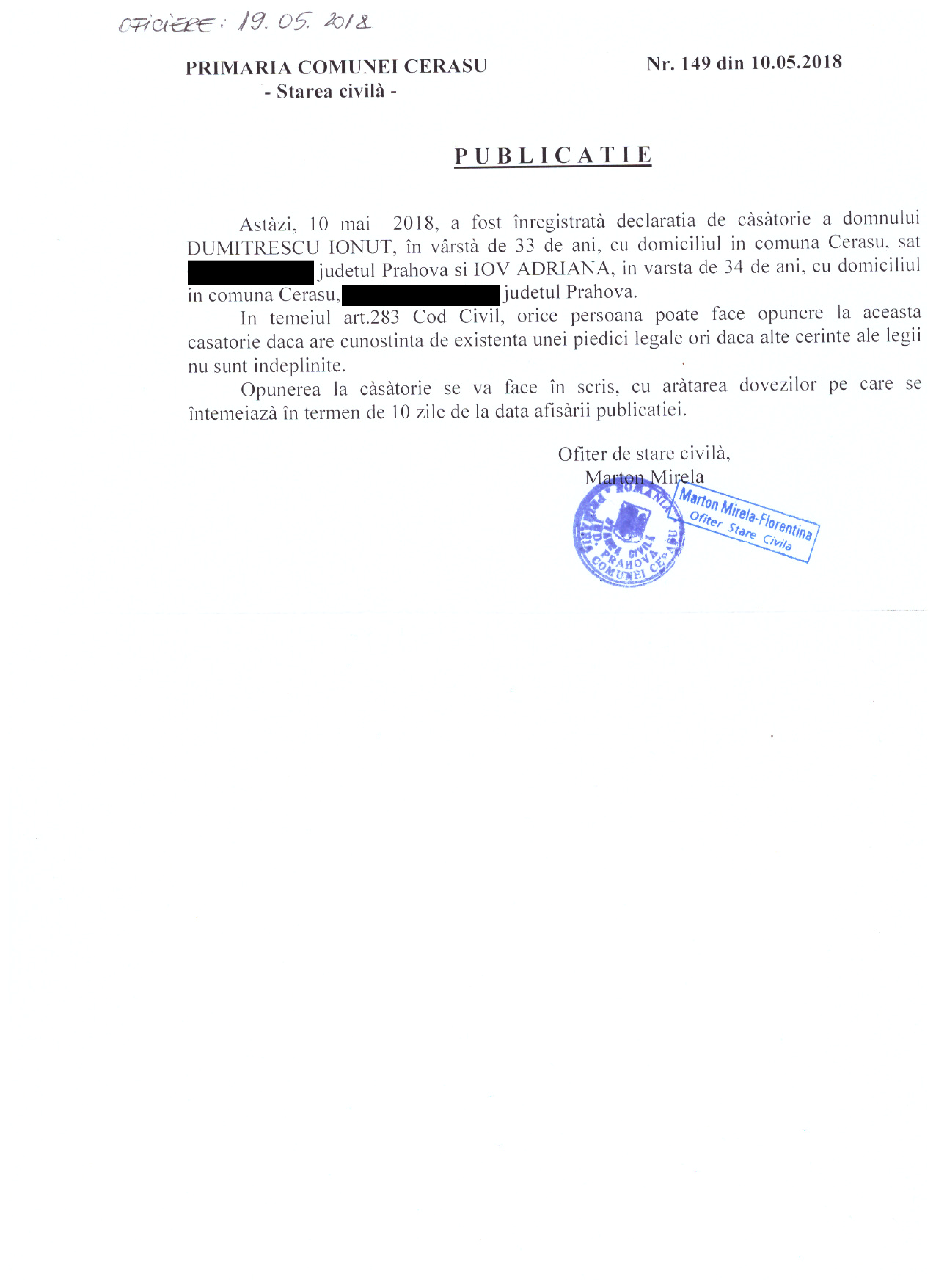32. Publicatia de casatorie nr. 149 din data de 10.05.2018 (Dumitrescu Ionut si Iov Adriana)