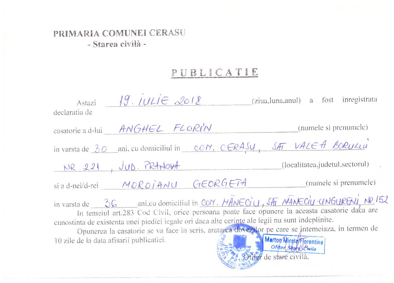 36. Publicatia de casatorie din data de 19.07.2018 (Anghel Florin si Moroianu Georgeta)