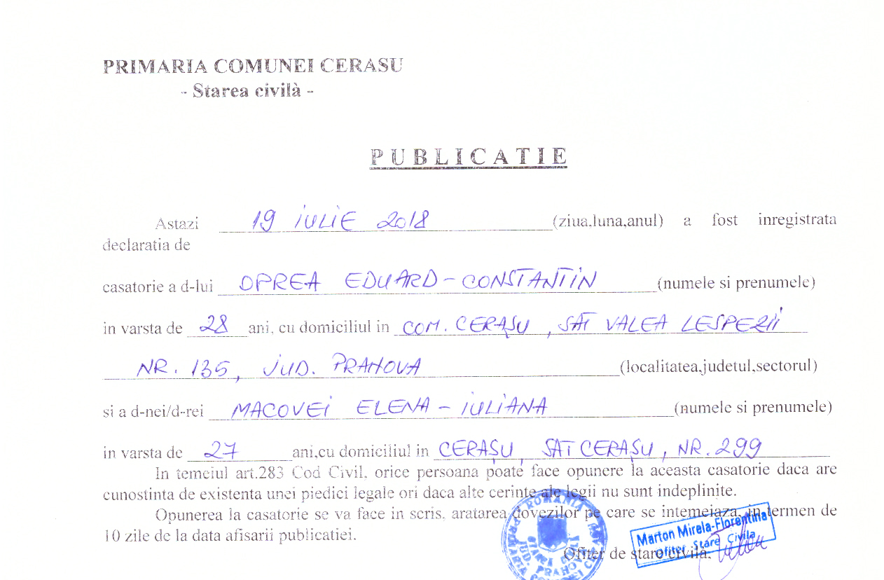 36. Publicatia de casatorie din data de 19.07.2018 (Oprea Eduard Constantin si Macovei Elena Iuliana)