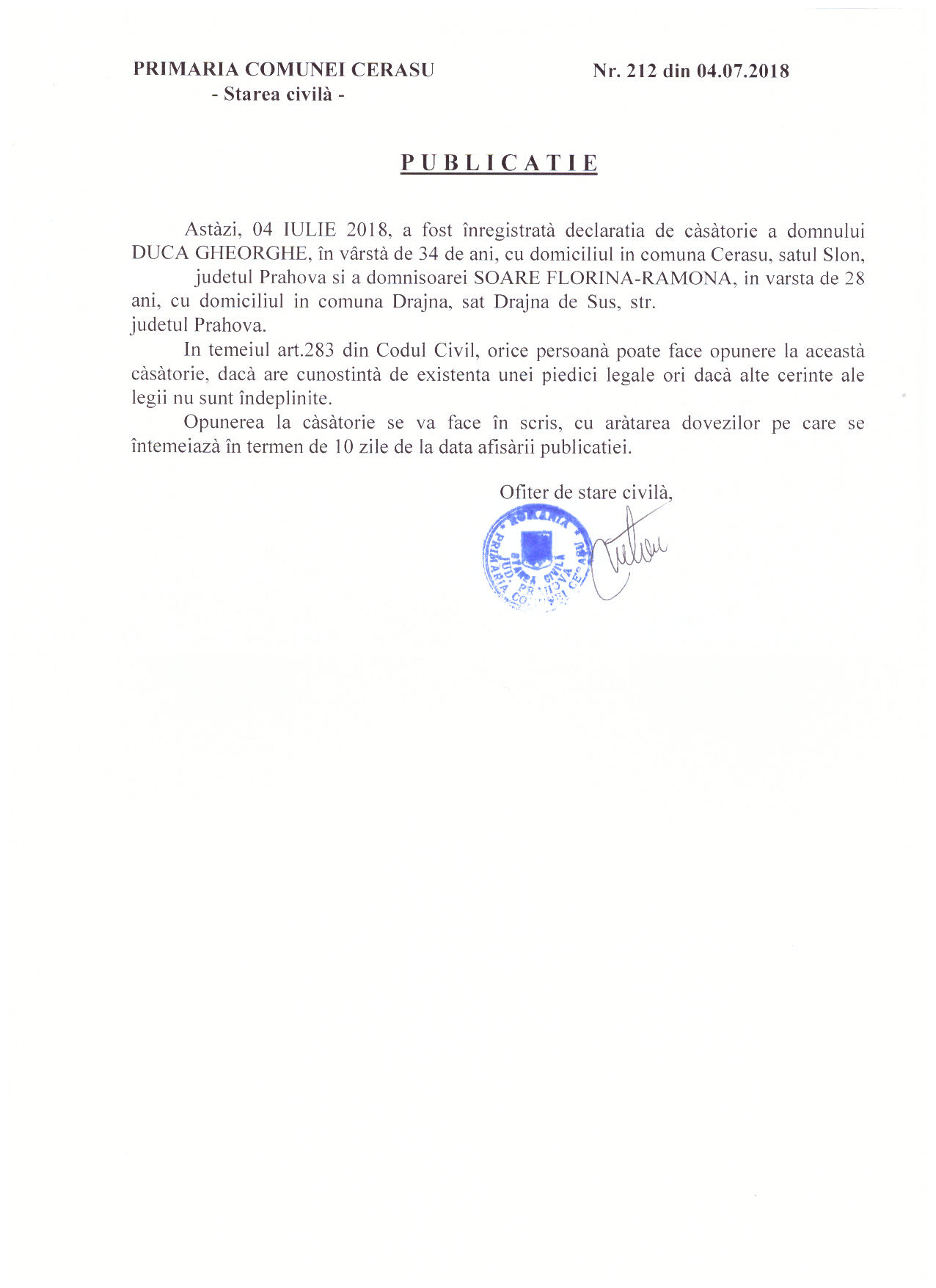 34. Publicatia de casatorie nr. 212 din data de 04.07.2018 (Duca Gheorghe si Soare Florina-Ramona)