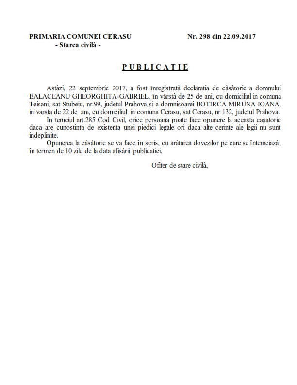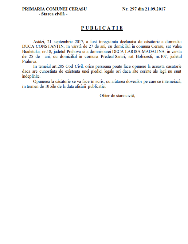 20. Publicatia de casatorie nr. 297 din data de 21.09.2017 (Duca Constantin si Deca Larisa-Madalina)