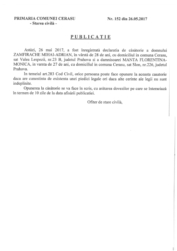 7. Publicatia nr. 152 din data de 26.05.2017 (Zamfirache Mihai-Adrian si Manta Florentina-Monica);