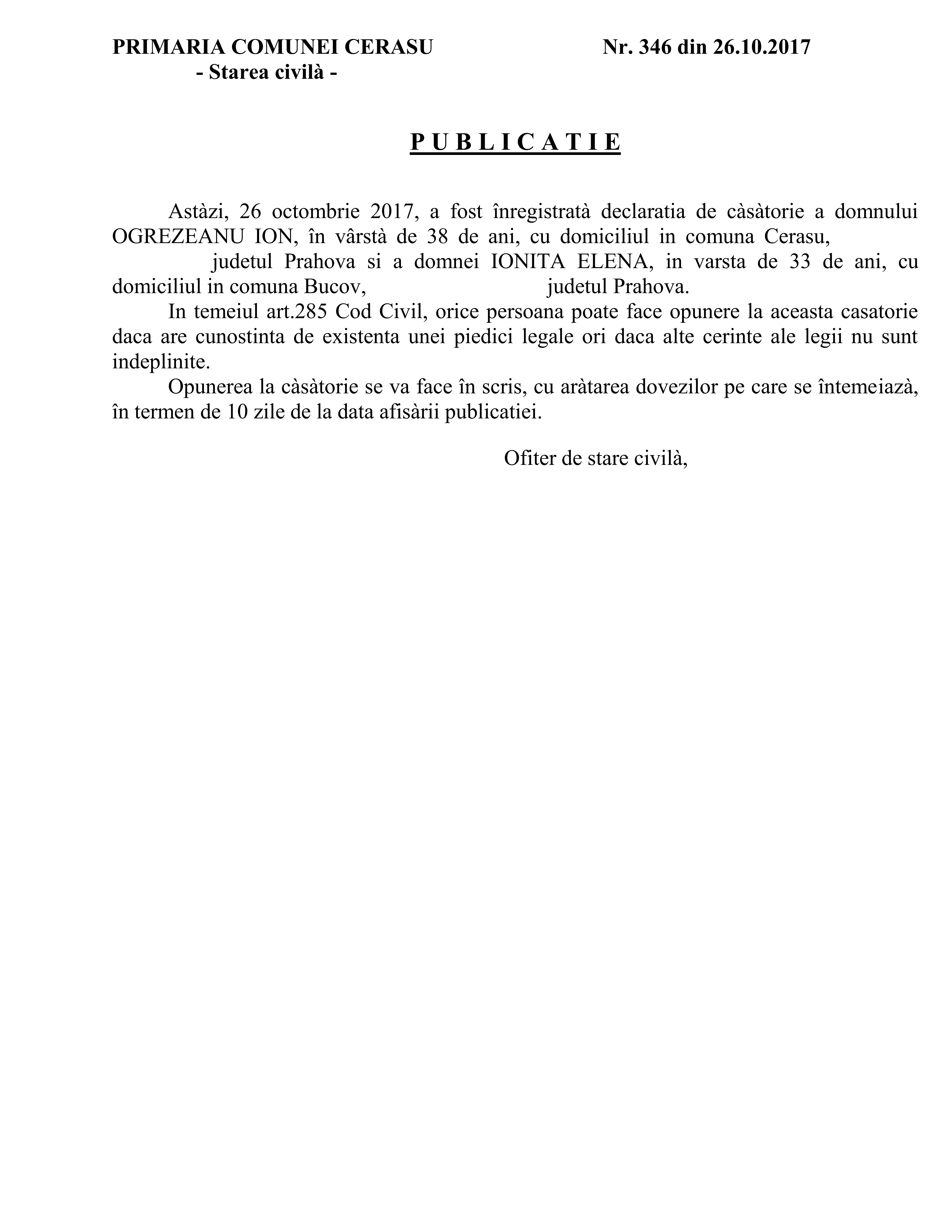 25. Publicatia de casatorie nr. 346 din data de 26.10.2017 (Ogrezeanu Ion si Ionita Elena)