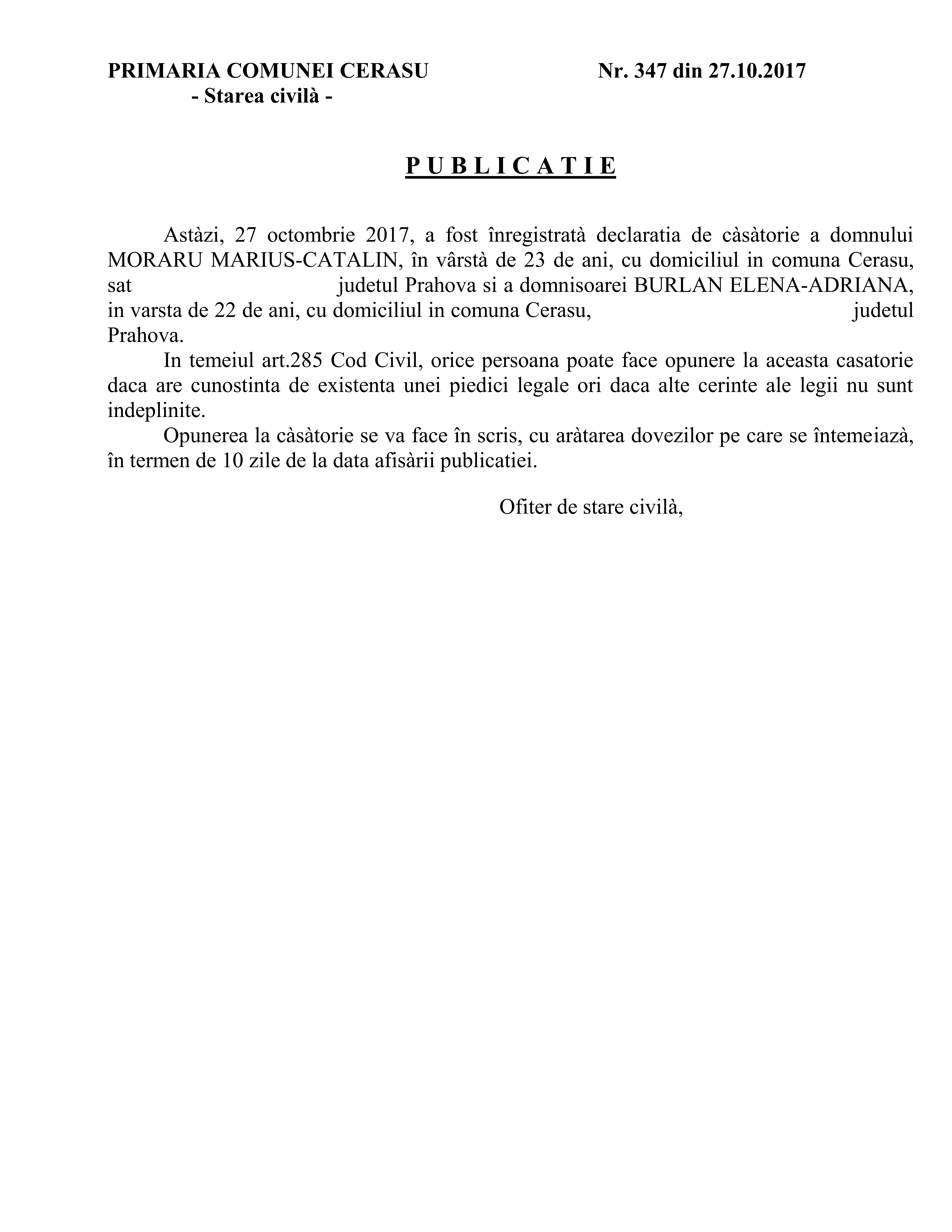 27. Publicate de casatorie nr. 357 din data de 10.11.2017 (Doicaru Ion si Fuscan Elena Nadia)
