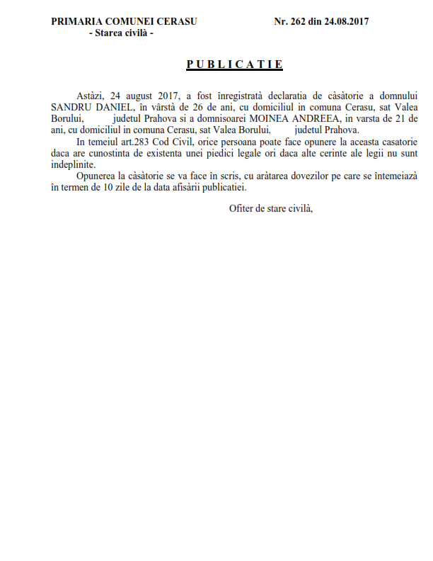18. Publicatia de casatorie nr. 262 din data de 24.08.2017 (Sandru Daniel si Moinea Andreea)